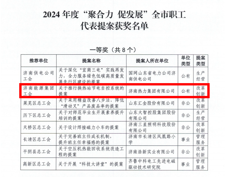 近日,在济南市厂务公开民主管理协调小组办公室开展的2024年度聚合力促发展全市优秀职工代表提案征集评选活动中...