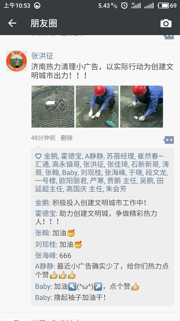 小小的举动,大大的文明,供热五公司外网班工作人员能够从思想上高度认识到创城工作的重要性。在进行日常的巡检的同时,不忘记树立集团公司的社会形象,不放过身边一点“不文明”的行为。可是路边上的小广告总是会不断的出现,环卫工人、志愿者、文明市民等人群清除不断。为了呼吁大家都能够参与到创城工作中去。外网班员工张洪征通过“万能的”朋友圈将热力集团员工巡检时的文明行为进行分享。通过“万能的”朋友圈呼吁大家在工作或者平时生活中多多留意身边力所能及的事情,共同为创城贡献自己的力量。朋友圈一经发出,便得到了大家的认可和点赞,这不仅是对随手清除小广告这一行为的支持,更是对热力集团文明的社会形象点赞。