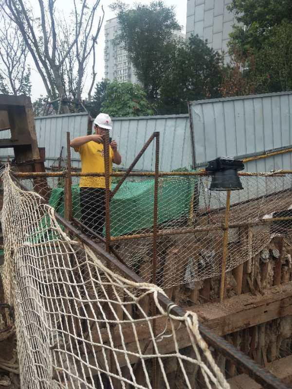 茂二解放东路顶管工程位于茂岭二号路与解放东路路口西北角绿化带内,工作坑深达10.2米,虽然有钢管桩支护,但因深度太深外加雨天湿滑,着实让人担心。