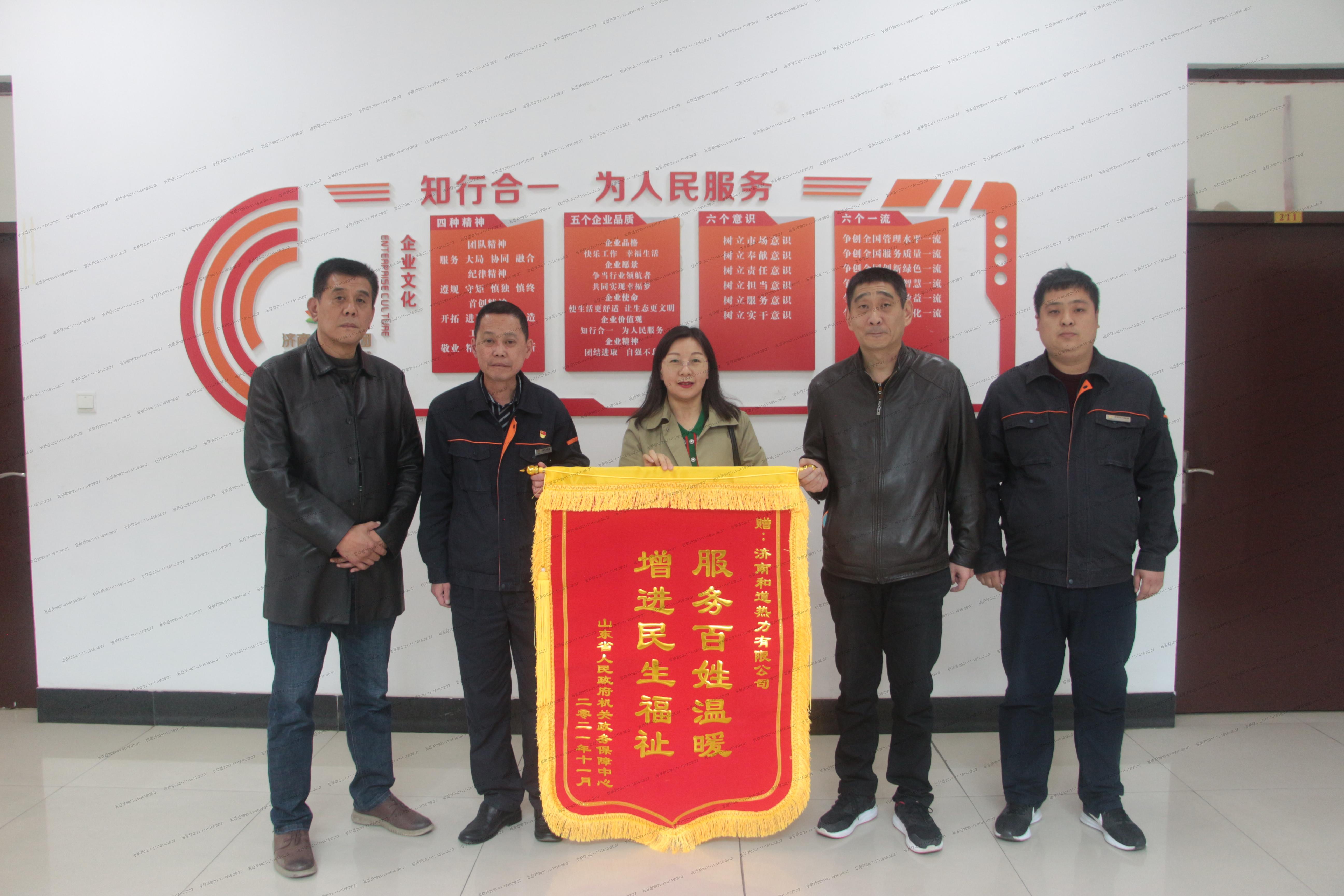 11月3日下午,山东省人民政府机关政务保障中心处长宋欣等一行人来到济南和道热力有限公司,对热力集团贴心高效的供热服务表示感谢,并为和道公司送上印有“服务百姓温暖,增进民生福祉”的锦旗。