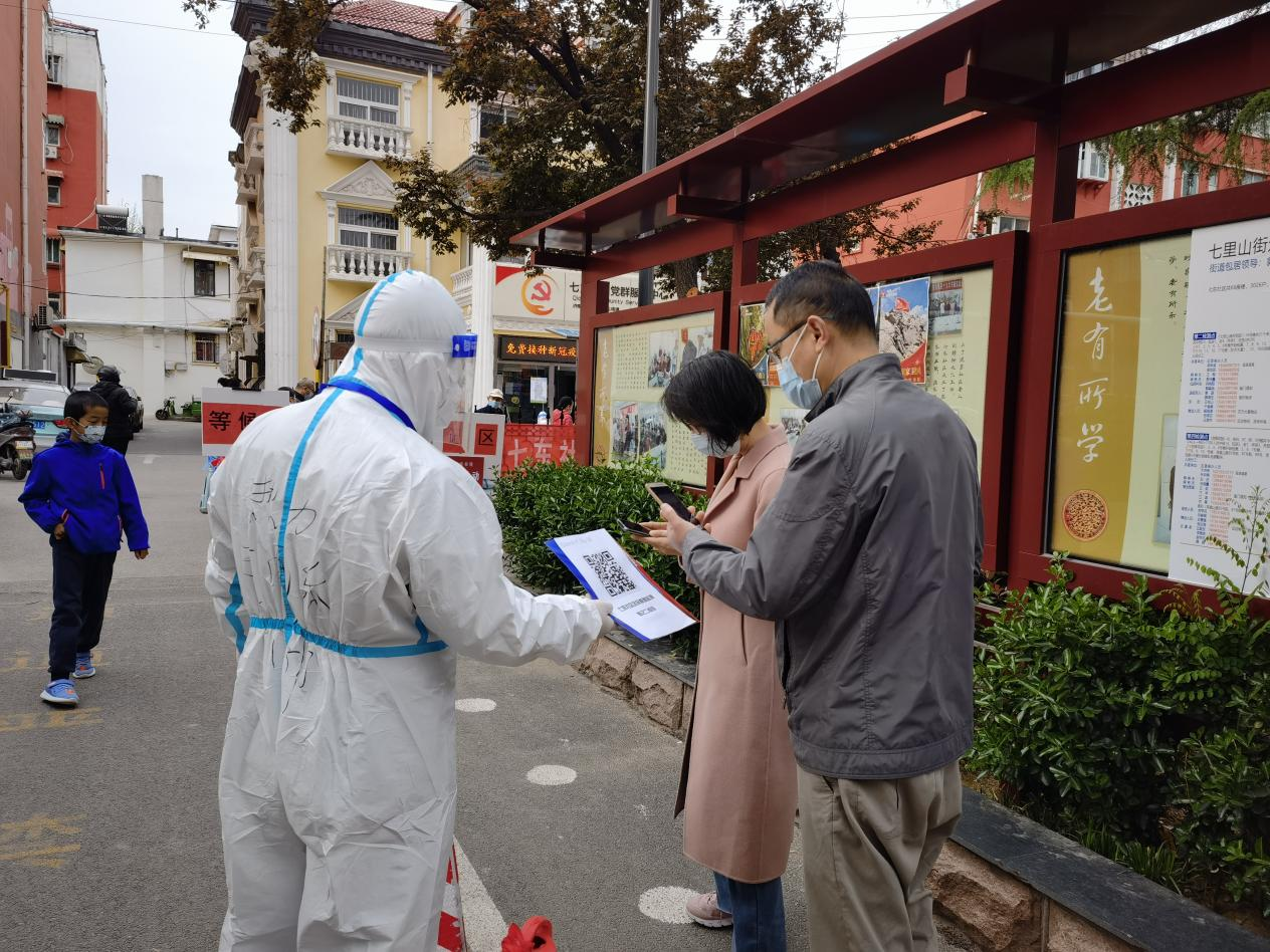 “请保持间隔一米,有序排队!”。在七东社区另一旁的青年志愿者丁书美正在帮助和引导前来参检的居民进行扫码登记。由于七东社区老年人比较多,不会使用智能手机扫描核酸验证码,丁书美主动打开自己手机热点贡献流量并协助老人操作手机。