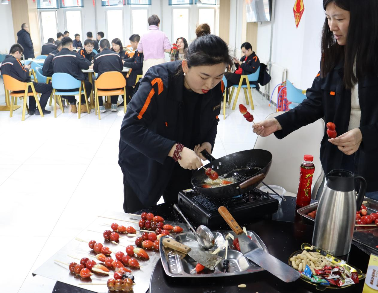 在冰糖葫芦圆又圆展区,职工和家属一起体验做冰糖葫芦的快乐,大家挑选自己喜欢的水果,将新年的愿望穿成串,忆传统、串酸甜,甜甜蜜蜜迎新年。