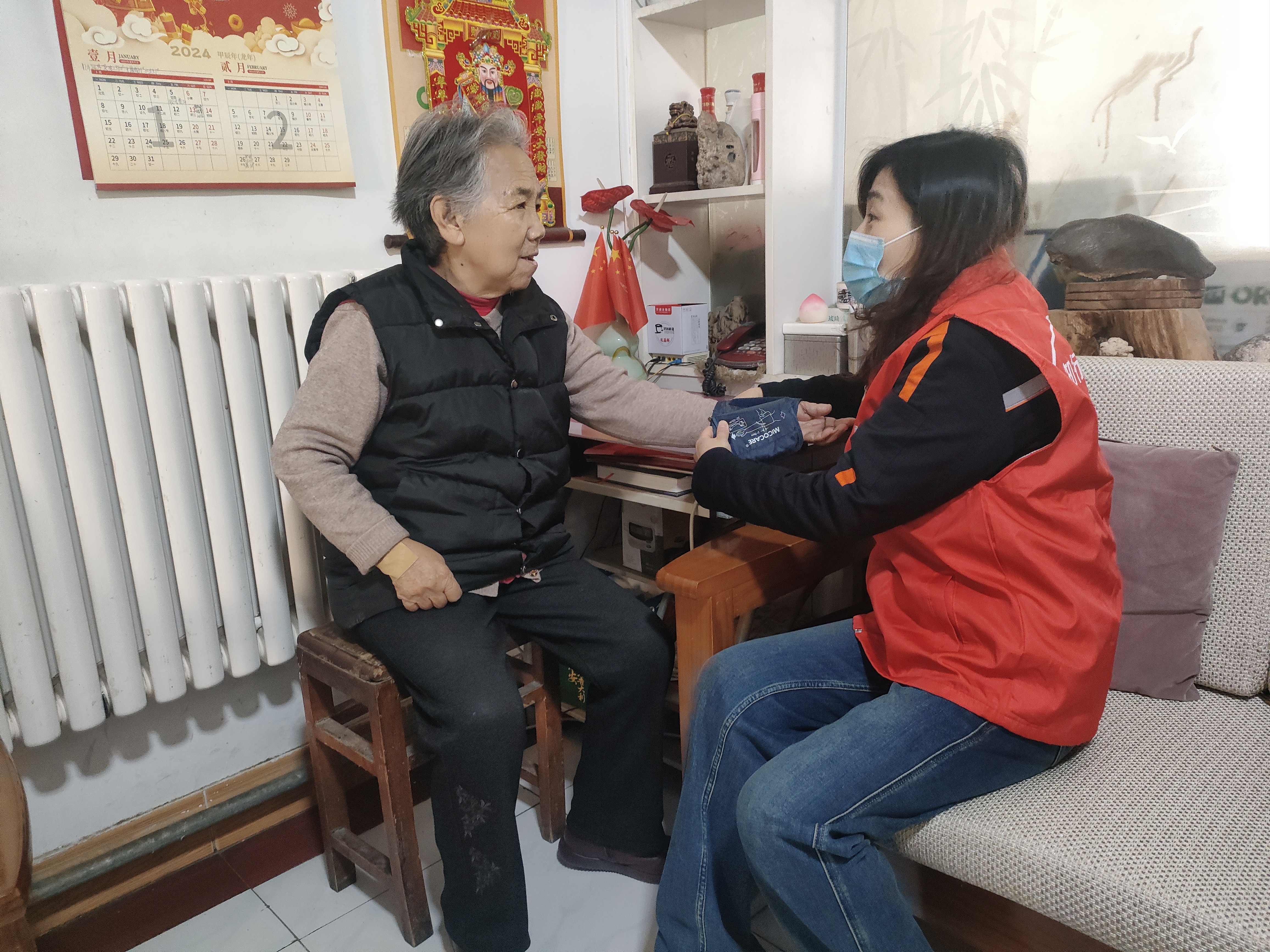 活动当天,志愿者们来到位于南全福社区的时阿姨家,据社区工作人员介绍,老两口患病多年,子女在外地工作,平日都是阿姨操持家里的大小事务。来到时阿姨家中后,志愿者们先是送上米、面、油等慰问品,了解家中近况,并为时阿姨测量血压,叮嘱阿姨注意身体健康。一同前来的供暖管家还仔细检查了家中供热设施,确保家中正常用热。随后,志愿者们又来到郭阿姨家,正巧快到午饭时间,志愿者们拿出提前准备好的水饺馅,为郭阿姨准备午饭。志愿者们一边和郭阿姨聊天,一边和面、擀皮、包馅,不一会儿一盘水饺就包好了,郭阿姨也开心地说,“家里好久没这么热闹过了!”等水饺下锅的功夫,志愿者们将郭阿姨家的卫生死角进行了细致清理,并表示有什么困难及时跟社区沟通,我们一定提供力所能及的帮助,浓浓的敬老爱老情随着饺子的阵阵香味弥漫在心尖。