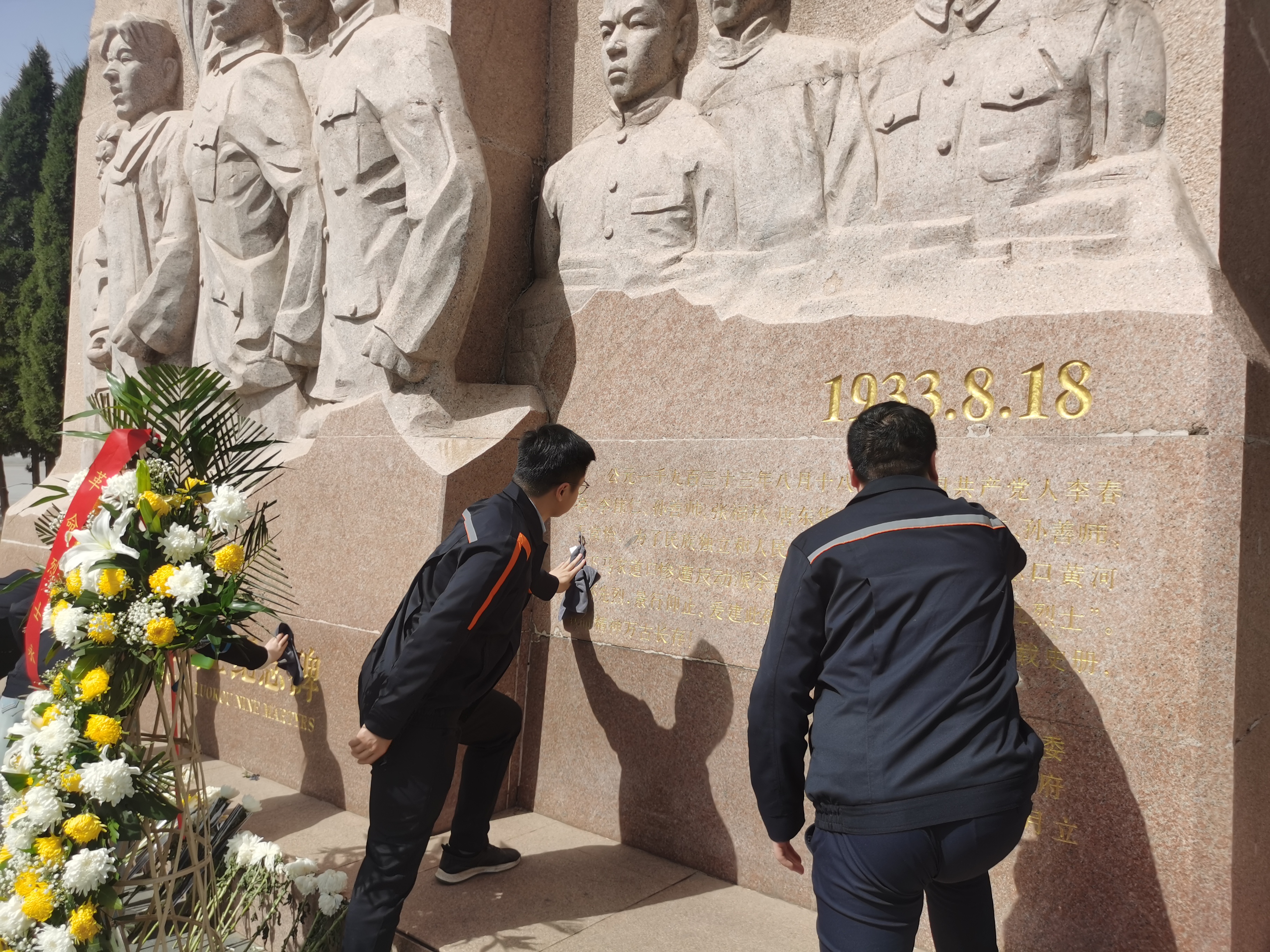 济南泺口九烈士纪念碑位于济南百里黄河风景区内,步入黄河百里长堤,两行苍松翠柏渐次排开,一条黄色长龙滚滚东去,泺口九烈士纪念碑就安静地坐落在长堤上的苍松翠柏之间。参加活动的党员在纪念碑前庄严肃立,怀着崇敬心情认真聆听李春亭、李伟仁等九位革命先烈为了民族独立和人民解放,在泺口黄河堤下英勇就义的革命事迹,感受革命先烈不屈不挠的斗争精神和共产党人坚定崇高的气节。党员们轻轻擦拭纪念碑上的灰尘,为革命先烈敬献鲜花,向他们致以最崇高的敬意和深切的悼念。