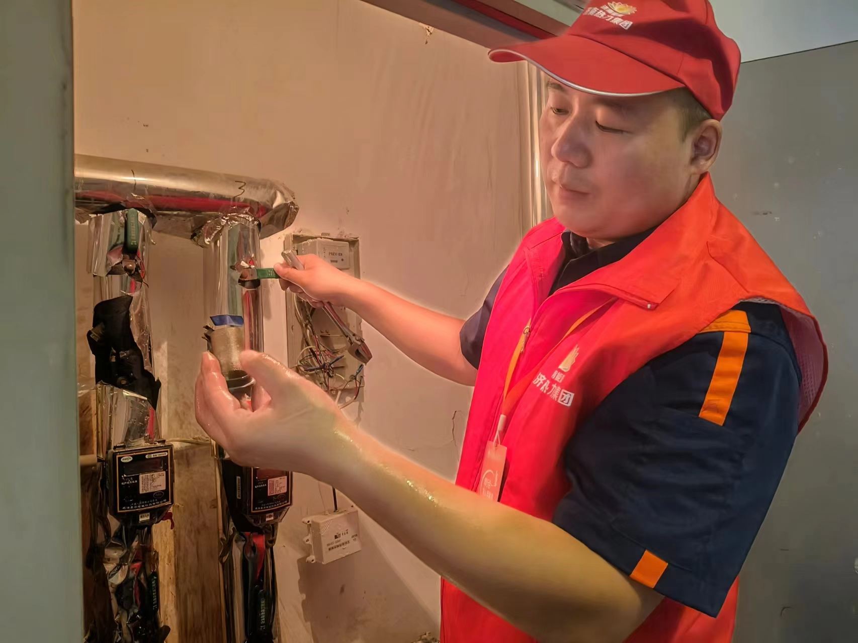 日常巡检是察觉隐患的重要途径。现场每一台关键设备、重要管线、隐患点都装在他心里,哪儿需要特别关注,哪儿在特殊天气容易出问题,他心里都有本账。刘承龙常说:“要像熟悉自己的身体一样熟悉供热设备机组的各项参数和运行状态,才能顺利完成供热任务。”他总是有条不紊的安排好各项工作,清洗入户过滤网行动在前,过滤网作用是防止供暖管道内有杂物进入用户家,防止用户家造成堵塞,供暖管家需要先将供回水球阀关闭,将入户除污器螺丝拆卸下来,拆卸螺丝时一定要注意不要使太大劲从而防止管件松动漏水,由于他所负责的片区多为老旧小区且无电梯,他只能手拿一个小桶、一副扳手、一把刷子挨家挨户爬楼清洗,清洗干净后在放回除污器内,保证户户干净、户户合格。既能解决了冬天入户流量小,温度低等问题,又方便了用户温暖舒适用热。