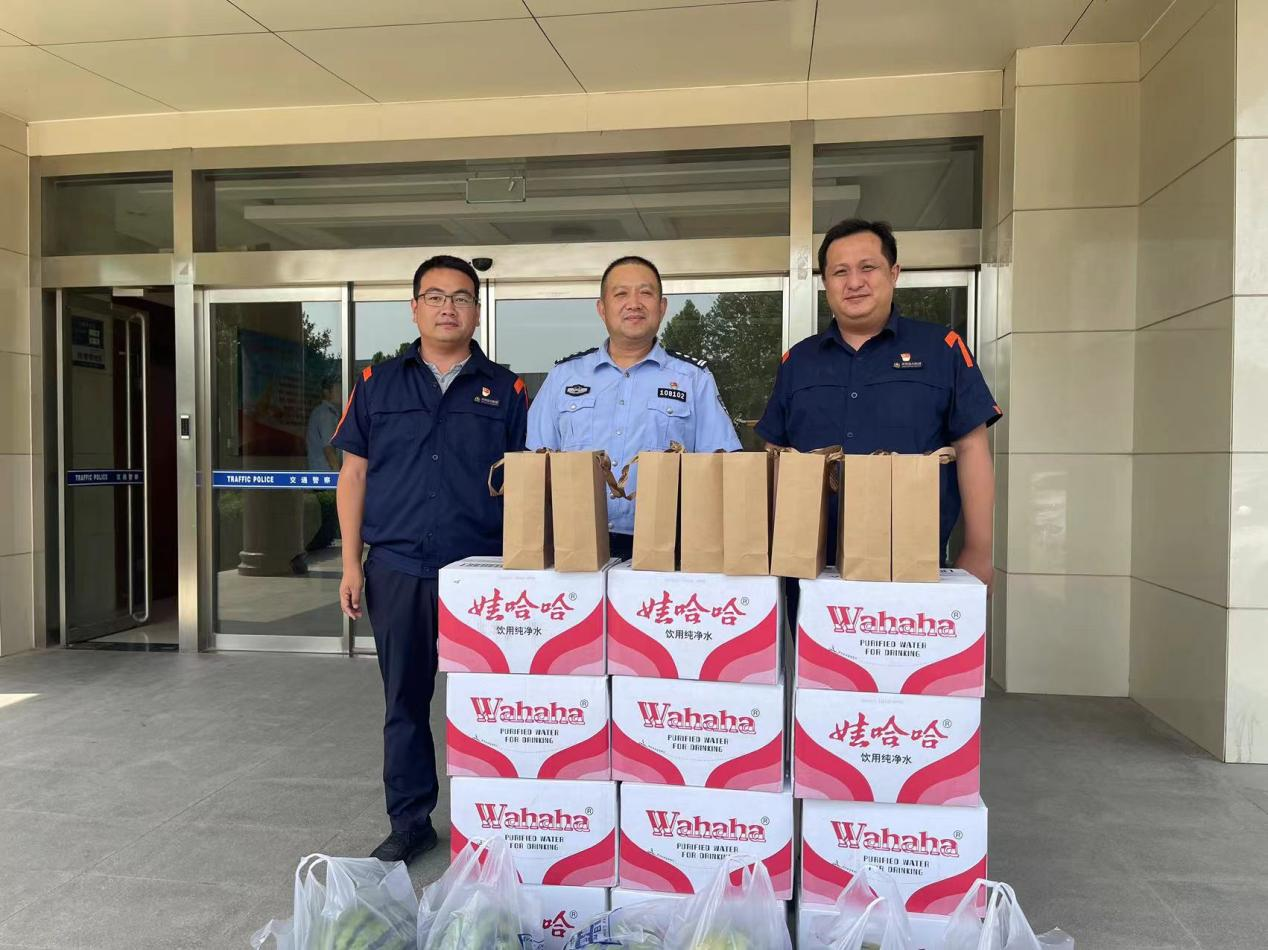 和康分公司准备了矿泉水、西瓜等清凉物品,由副总经理高洪民和工程管理处处长李凯凯送到了交警们的手中。当交警们接过这些物品时,他们的脸上露出了感激的笑容。一位交警告诉我们:“在高温下工作确实很辛苦,但是有了你们的支持和关心,我们感到无比温暖和力量。”