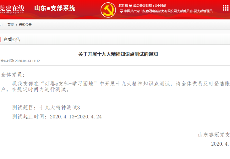 测试依托灯塔党建在线,采取在线答题形式进行。内容以党的十九大报告为主,设置了单选题、多选题等形式。通过真学真考,以考促学,确保全体党员学习党的十九大精神入脑入心。