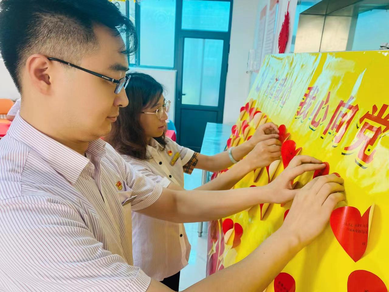 “党在我心,我心向党......”评比结束,所有党员在火热的红心上写下了最美的祝福,在金黄的展板上,鲜艳的党徽下,一颗颗红心承载着大家笔笔忠心,表达着对党和祖国的热爱和美好祝福!