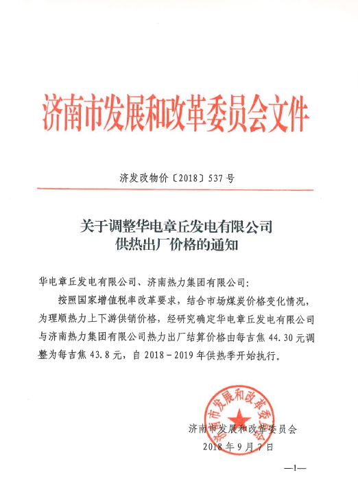 关于调整华电章丘发电有限公司供热出厂价格的通知