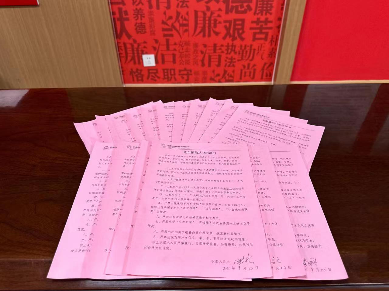 党支部副书记、纪检委员范尊光说,“供暖管家是服务人民群众的‘娘家人’和‘服务员’,要时刻加强党的理论学习,提高党性自觉,落实‘一岗双责’,在自己的岗位上为群众服好务,切实防止工作中出现违纪违规情况,防止出现风险漏洞,要强化廉洁自律的‘底线’‘红线’意识,严明纪律要求,坚决杜绝吃、拿、卡、要等违规违纪行为的发生,切实增强贯彻落实中央八项规定精神的思想自觉和行动自觉,实现高效廉洁服务。”最后,党员干部分别签订《党员廉洁从业承诺书》,筑牢防线,不踩红线。