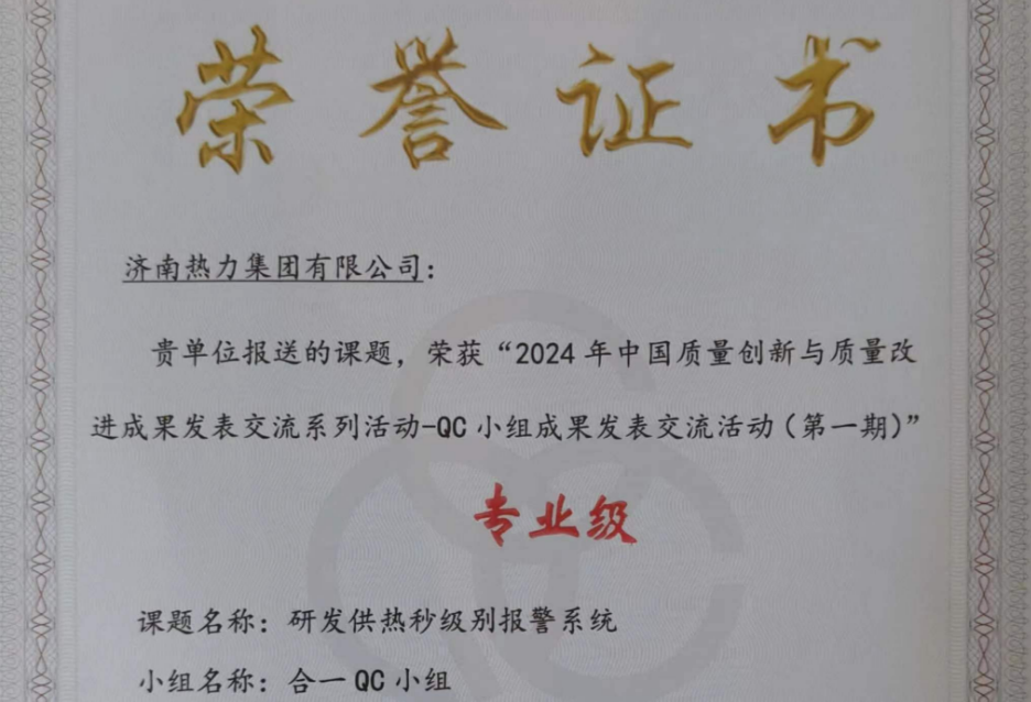 近日,中国质量创新与质量改进成果发表交流会(中国质量管理协会)传来喜讯,济南能源集团所属ok138太阳集团“合一”QC小组发表的创新型成果,《研发供热秒级别报警系统》荣获2024全国QC小组成果“专业级”奖项。