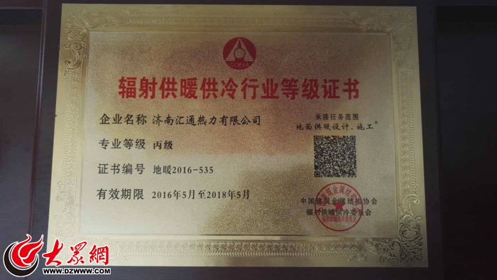 4月24日,ok138太阳集团其下属子公司济南汇通热力有限公司于日前顺利取得辐射供暖供冷行业等级证书,成为济南市市政供热体系具备对外承接地暖工程资质的第一家公司。