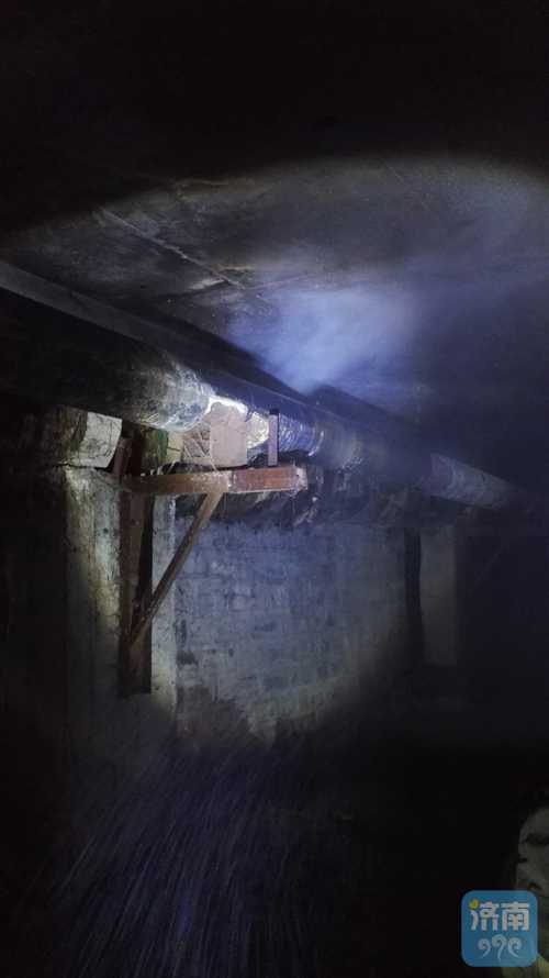 记者观察到,暗河上方悬挂着粗细不同的两根管道,一根是送水管、一根是回水管,巡检时,工作人员拿着手电仔细检查管道上的每一寸地方。