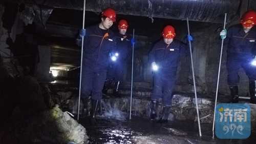 不到半小时,杨兆明和同事便来到此次“下河”的百花小区,换上雨靴,带上探照灯与钢管,记者与他们一起下到河里。虽是寒冬时节,暗河内的水却没有结冰,潺潺水流在河道内静静流淌,在寒冬腊月里趟水,记者还是第一次。