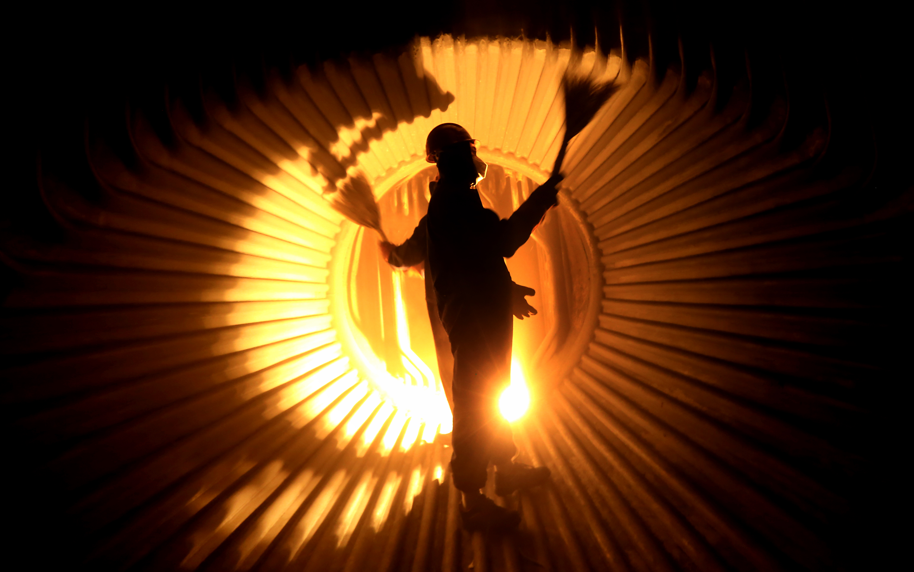 “锅炉清灰很不容易”,李伟燕表示,浆水泉热源厂的高效煤粉炉未改造前,锅炉内还留有可供工人站立的炉排,改造后的炉膛只是高约十七八米的空间,需要从底部搭四、五层的脚手架,才能将炉膛壁、锅炉高温和低温受热面的炉灰清扫下来,然后通过抽风机抽出。此外,炉膛是密闭空间,空气流通效果很差,清灰时就像经历沙尘暴。工作人员身穿连体防护服包裹严实,清扫一到两个小时后,从锅炉内爬出来都是汗水和泥灰的混合,一般一台锅炉七八个清灰工人3天左右才能清扫干净。截至目前,大部分的清灰工作已经基本完成。