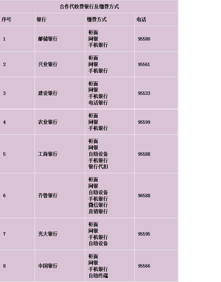 4.银行交费。用户可持现金到济南市邮政局、中国银行、浦发银行、齐鲁银行、中信银行、工商银行、建设银行、光大银行、邮政储蓄银行、济南农商银行、民生银行各网点交纳采暖费。此外,持招商银行、兴业银行、中国银行、浦发银行、齐鲁银行、中信银行、建设银行、光大银行、邮政储蓄银行、工商银行、济南农商银行、民生银行卡的用户,还可通过网上银行、手机银行等方式交纳采暖费。