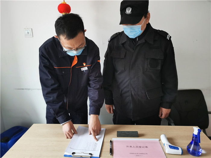 和义热力党员高国庆与同事认真核对外来人员登记信息