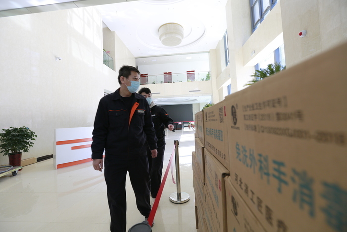 防控物资,统一配发。面对疫情期间严峻的物资紧缺形势,防控组通过多种合法合理渠道全力采购防疫物资,并根据各单位及岗位需求第一时间进行配发。截止2月17日,疫情处置工作领导小组累计向各单位发放口罩41014只,库存33971只;消毒剂累计发放1704公斤,库存121公斤;酒精累计发放365.25公斤,库存234.75公斤;体温计发放16只,库存7只;喷洒器发放25台,库存3台,小喷壶发放30个;手套发放90副,库存160副;护目镜库存20副;洗手液发放729瓶,库存1351瓶。目前各类防疫物资备货充足,能够满足各单位防疫需求。